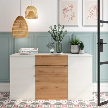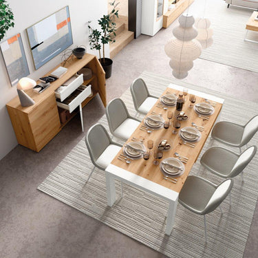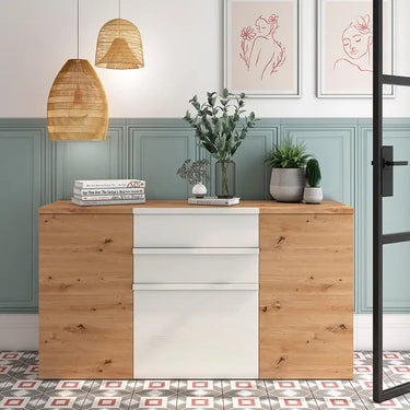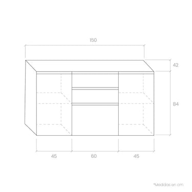 Con estructura en resistente tablero laminado natural, el aparador CATANIA 2 de 180 cm ofrece una solución funcional y estética para tu salón o comedor. Dispone de cinco amplios espacios de almacenaje y dos cajones centrales, ideales para mantener el orden con estilo.