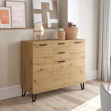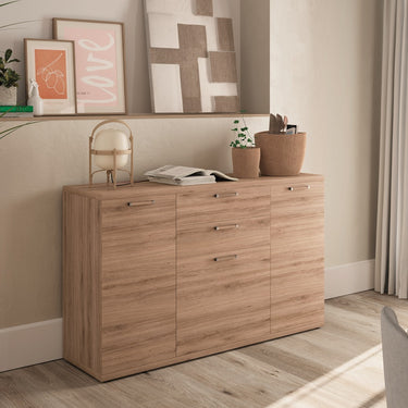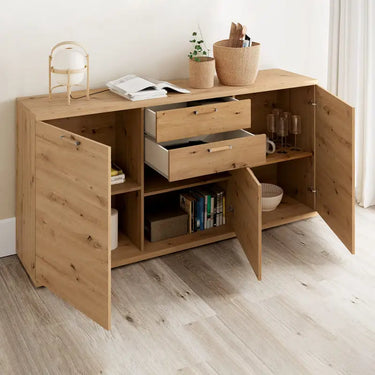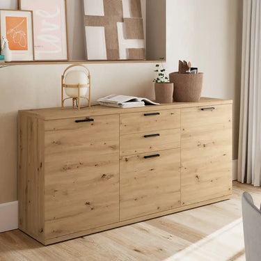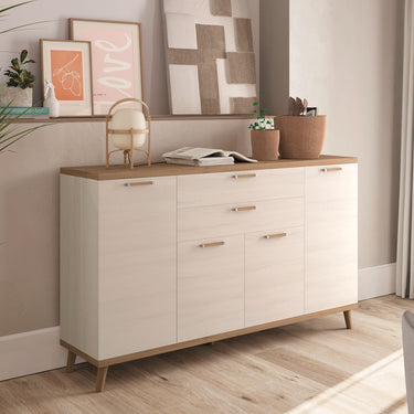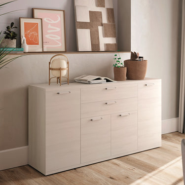 Aporte un toque de elegancia y funcionalidad a su salón con el aparador BOLONIA de 180 cm. Su diseño incluye tres puertas y dos cajones, ofreciendo un generoso espacio de almacenaje para mantener su hogar en orden sin renunciar al estilo.