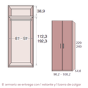El armario de 2 puertas de la colección SIENA es la opción perfecta para quienes buscan elegancia y almacenamiento eficiente en espacios más compactos. Disponible en dos alturas y dos longitudes, se adapta con facilidad a tus necesidades. Las puertas batientes ofrecen un acceso cómodo, incorpora 1 estante y 1 barra para colgar y puedes completarlo con accesorios como barra basculante, corbatero, zapatero, cajón relojero o pantalonero. Todo con acabados de alta calidad y opciones de personalización en cada detalle.