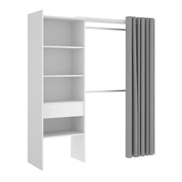 El armario vestidor con cortina de la colección PERUSA es una opción práctica, juvenil y versátil para organizar tu ropa con estilo. Su estructura multi configurable se adapta fácilmente a diferentes medidas, simplemente cortando la barra a la longitud deseada. Incluye un cajón organizador para prendas pequeñas y una cortina frontal que aporta ligereza visual y comodidad en el uso diario.
