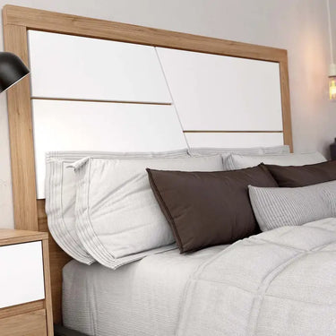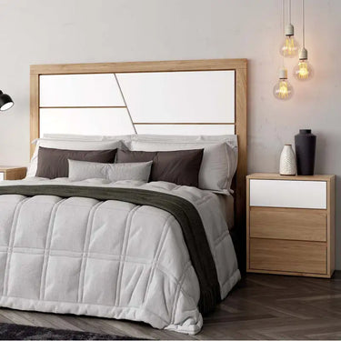 Diseño de líneas limpias con detalle geométrico rebajado en paralelas y diagonales. Su estilo moderno y elegante lo hace ideal para cualquier dormitorio. Fabricado con tableros de alta resistencia y acabado melamínico.