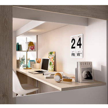La cama alta KIKU es una solución todo en uno para dormitorios juveniles que buscan funcionalidad sin renunciar al diseño. Incorpora una amplia mesa de estudio y un armario cerrado, todo en el mismo espacio que ocupa una cama. La cama superior es accesible desde el frente y admite colchones de 90x190 o 90x200 cm. Su diseño compacto, reversible y sin necesidad de somier se adapta con facilidad a cualquier ambiente juvenil.