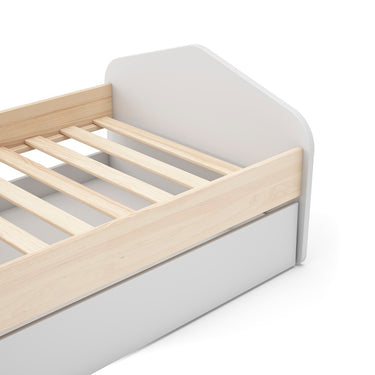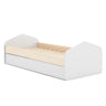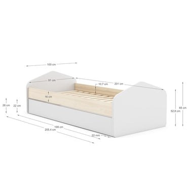 La cama nido ESFANIA es una opción práctica y acogedora para dormitorios infantiles o juveniles. Fabricada en material laminado de primera calidad, destaca por los detalles en los extremos en madera de chopo natural. Dispone de un cajón inferior con ruedas que puede usarse como almacenaje o como segunda cama con colchón de 90x190 cm. La cama superior es apta para colchones de 90x190 o 90x200 cm.