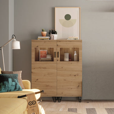 Incluye una vitrina/organizador de dos puertas y un módulo bajo para TV con dos huecos abiertos y dos puertas.