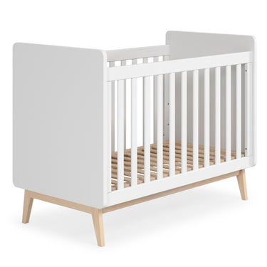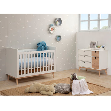 La cuna infantil YENDIS es una pieza acogedora y natural, ideal para crear un primer dormitorio lleno de calidez. Fabricada en DM y madera de pino, combina a la perfección con el acabado Blanco Cera. Su diseño tipo casita con laterales de tablas continuas permite ver al bebé mientras duerme y aporta un aire decorativo y tierno al ambiente. Apta para colchón de 60x120 cm.