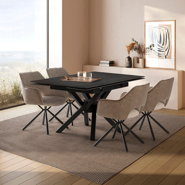 La mesa cuadrada extensible ENELRA Pizarra es la solución perfecta para quienes buscan versatilidad y estilo en su mobiliario. Su mecanismo extensible la convierte en una opción ideal para adaptar el espacio según el número de comensales. El sobre porcelánico gris efecto pizarra, fabricado en piedra sinterizada, destaca por su resistencia a rayones, manchas y altas temperaturas, garantizando durabilidad y fácil mantenimiento.