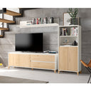 Conjunto de salón Lecce ambiente 51 compuesto por mueble de televisión, módulo con puertas y estantes, y estante de pared. Fabricado con tableros naturales de alta resistencia y acabados en melamina de alta calidad. Destaca por la pureza de sus tonos amaderados, que aportan equilibrio y calidez al espacio.