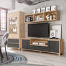 Conjunto de salón Chiara compuesto por mueble de televisión, vitrina con cristalera y estante de pared. Fabricado con tableros naturales de alta resistencia y acabados en melamina de alta calidad. Destaca por la pureza de sus tonos amaderados, que aportan un estilo cálido y acogedor al espacio.