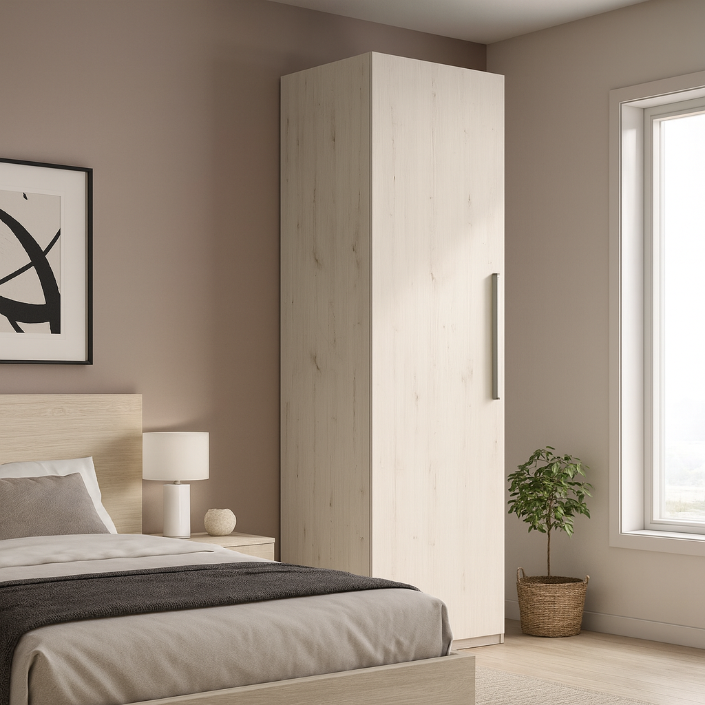 El armario Génova de una puerta combina diseño y practicidad para optimizar el espacio del dormitorio. Sus puertas batientes facilitan el acceso y la organización de prendas y accesorios, mientras que su acabado en Artisán, Roble o Albian permite integrarlo en diferentes estilos decorativos. Una pieza versátil y funcional que aporta orden y elegancia al hogar.