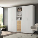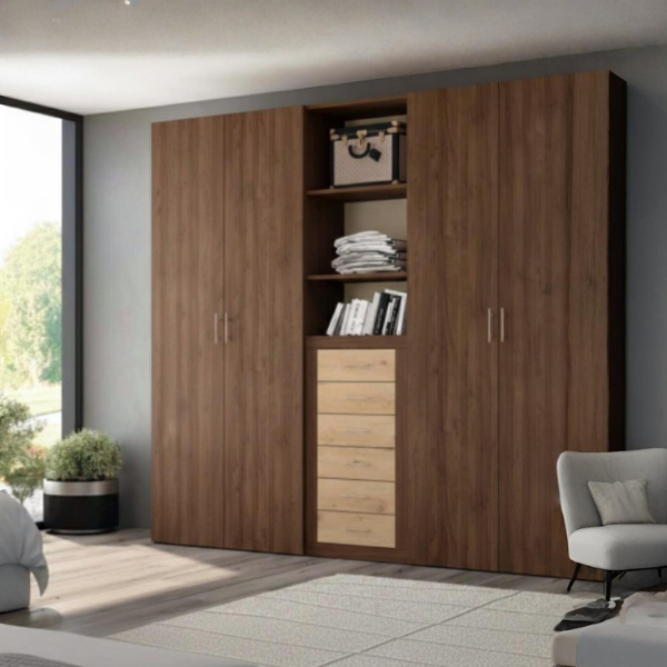 Amplio armario de 4 puertas dividido en dos cuerpos laterales, cada uno con su estante y barra para colgar. En la parte central, incluye 2 estantes abiertos y 6 cajones que multiplican el espacio de almacenaje. Además, es totalmente adaptable: puedes añadir los complementos que necesites para organizar el interior a tu medida.