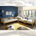 Convierte la habitación de tus hijos en un espacio funcional y divertido con nuestra litera infantil convertible MARTINA natural. Hecha de madera, esta opción práctica y versátil se transforma en dos cómodas camas individuales. ¡Una elección inteligente para un dormitorio feliz!