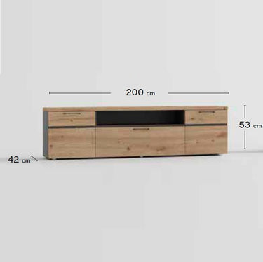 El Bajo TV Salón ROMA de 200 cm combina una amplia capacidad de almacenaje con un diseño cuidado, ideal para mantener el salón ordenado y elegante. Su distribución con puertas y un hueco permite organizar dispositivos y objetos de manera práctica, optimizando el espacio sin sacrificar el estilo. Una solución experta para integrar funcionalidad y sofisticación en tu zona de estar.