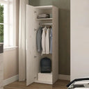 El armario Génova de una puerta combina diseño y practicidad para optimizar el espacio del dormitorio. Sus puertas batientes facilitan el acceso y la organización de prendas y accesorios, mientras que su acabado en Artisán, Roble o Albian permite integrarlo en diferentes estilos decorativos. Una pieza versátil y funcional que aporta orden y elegancia al hogar.