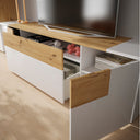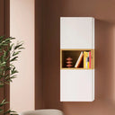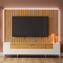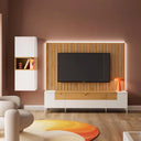 Formada por un mueble de TV con patas incluidas, una vitrina y un panel amaderado con finas líneas verticales, esta combinación aporta un toque de diseño único y equilibrio visual a tu hogar.