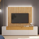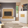 El mueble TV con panel rayado aporta un toque distintivo que se combina con la vitrina de tres puertas para crear un ambiente sofisticado y lleno de elegancia.