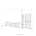 Incluye un mueble bajo para TV con dos cajones y dos puertas, un módulo alto con dos puertas y una estantería integrada que aporta almacenamiento adicional y equilibrio visual al conjunto.