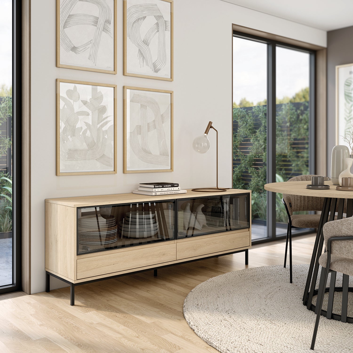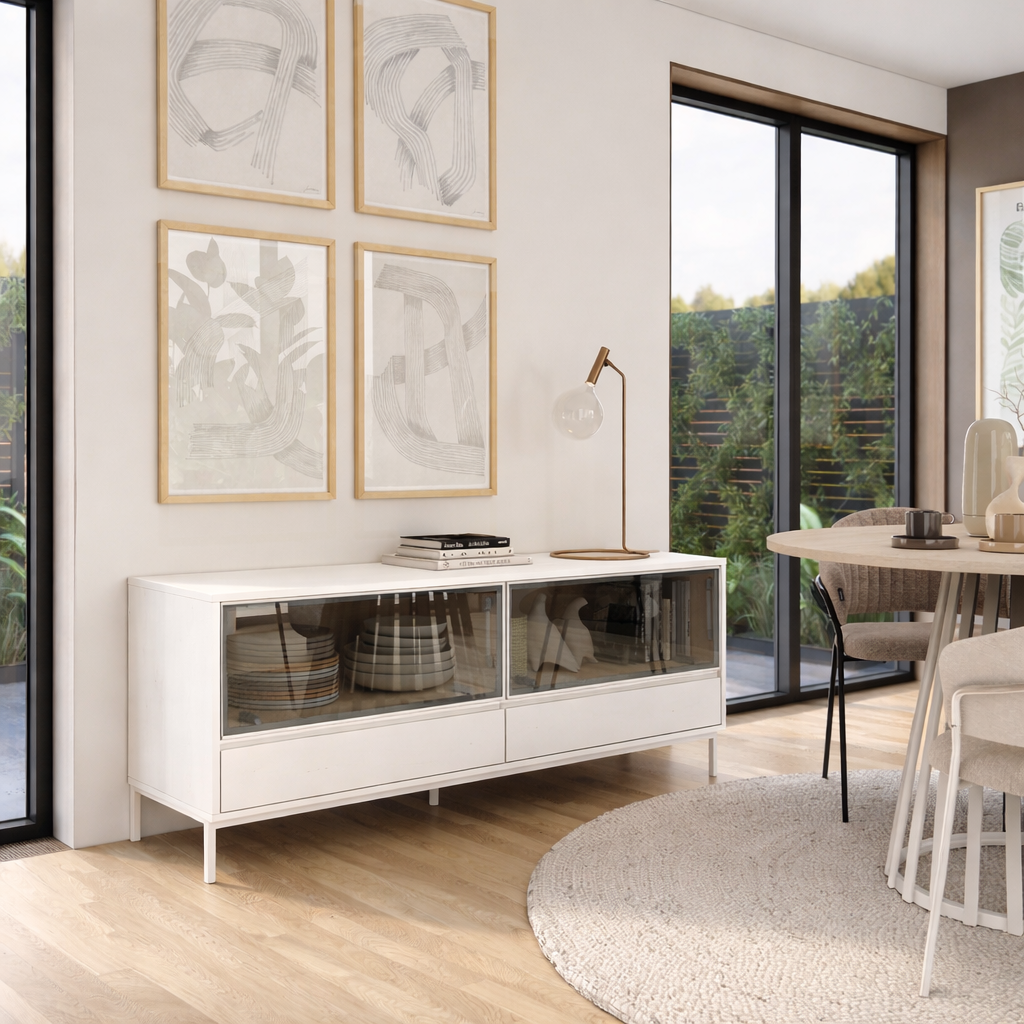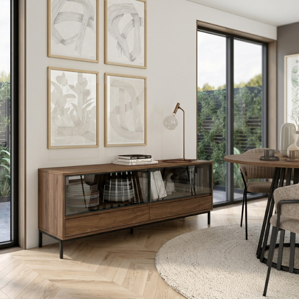 Este aparador de 150 cm destaca por su estética minimalista y su ligereza visual. Sus dos puertas abatibles de cristal aportan un toque elegante y permiten intuir el interior con sutileza, mientras que los dos cajones ofrecen una solución práctica para el día a día. Elevado sobre patas estilizadas, se integra con naturalidad en ambientes modernos y cuidados.
