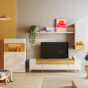 Incluye una vitrina colgada y una vitrina de dos puertas, combinadas con un mueble de TV con patas que aporta ligereza visual y un toque contemporáneo.