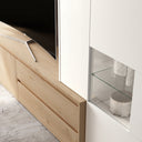 Incluye mueble de televisión, vitrina con cristalera y estante de pared, todo fabricado con tableros naturales de alta resistencia. Sus acabados en melamina de alta calidad y tonos amaderados puros aportan calidez y elegancia a cualquier espacio.