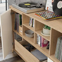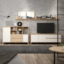 Conjunto de salón compuesto por mueble de televisión, aparador y dos estantes de pared. Fabricado con tableros naturales de alta resistencia y acabados en melamina de alta calidad, este conjunto pertenece a la colección LECCE, reconocida por la pureza de sus tonos y su estética contemporánea.
