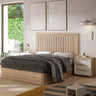 El cabecero, de diseño minimalista y elegante, aporta estilo al dormitorio gracias a sus finas líneas. Las mesitas de tres cajones ofrecen gran capacidad de almacenamiento y tiradores funcionales que completan el conjunto con armonía.
