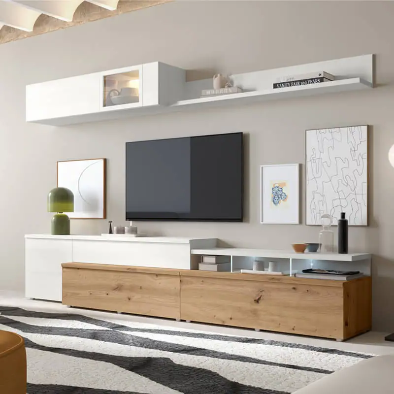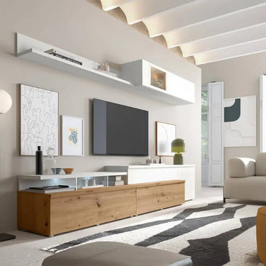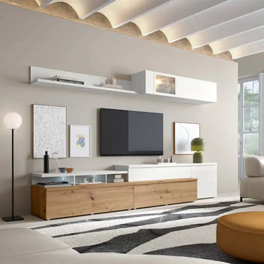 La composición de salón CATANIA 2 ambiente 7 combina un diseño elegante y funcional para maximizar el espacio de tu salón. Incluye un mueble para TV, un suplemento con estantes personalizables en madera o cristal, y un estante alto ideal para exhibir objetos, todo con acabados artisan y polar que aportan ligereza visual. Su estética limpia y moderna integra armónicamente las piezas, ofreciendo un ambiente ordenado y acogedor que se adapta a cualquier estilo de decoración. Perfecta para quienes buscan elegancia y practicidad en un solo conjunto.