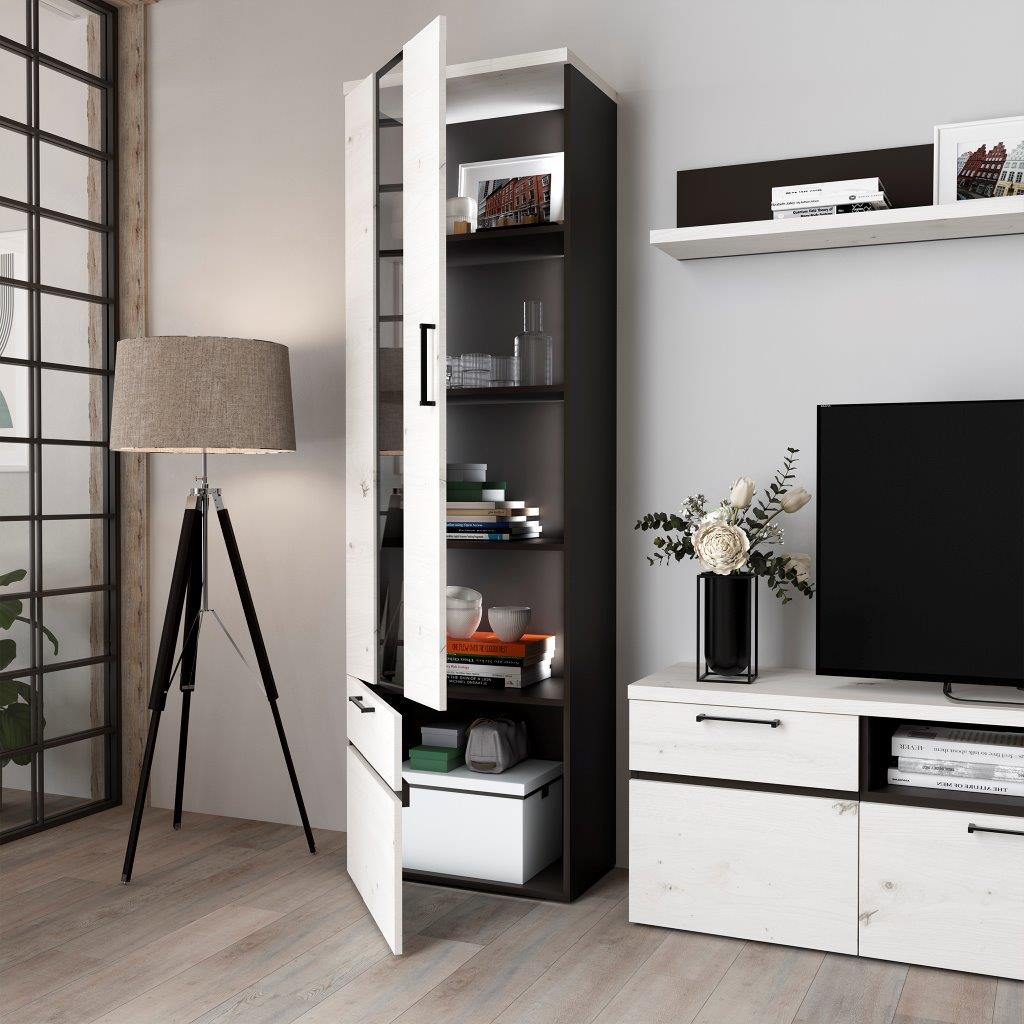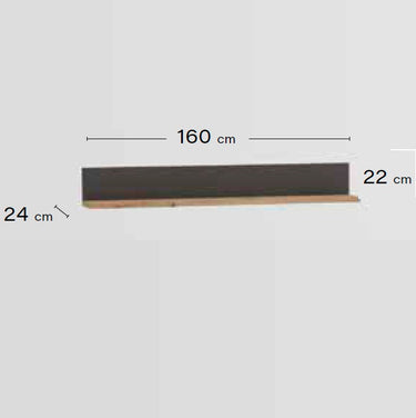 Incluye un mueble vitrina de 80cm, un mueble TV e 160cm y un estante pared a juego de 160cm.
