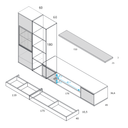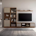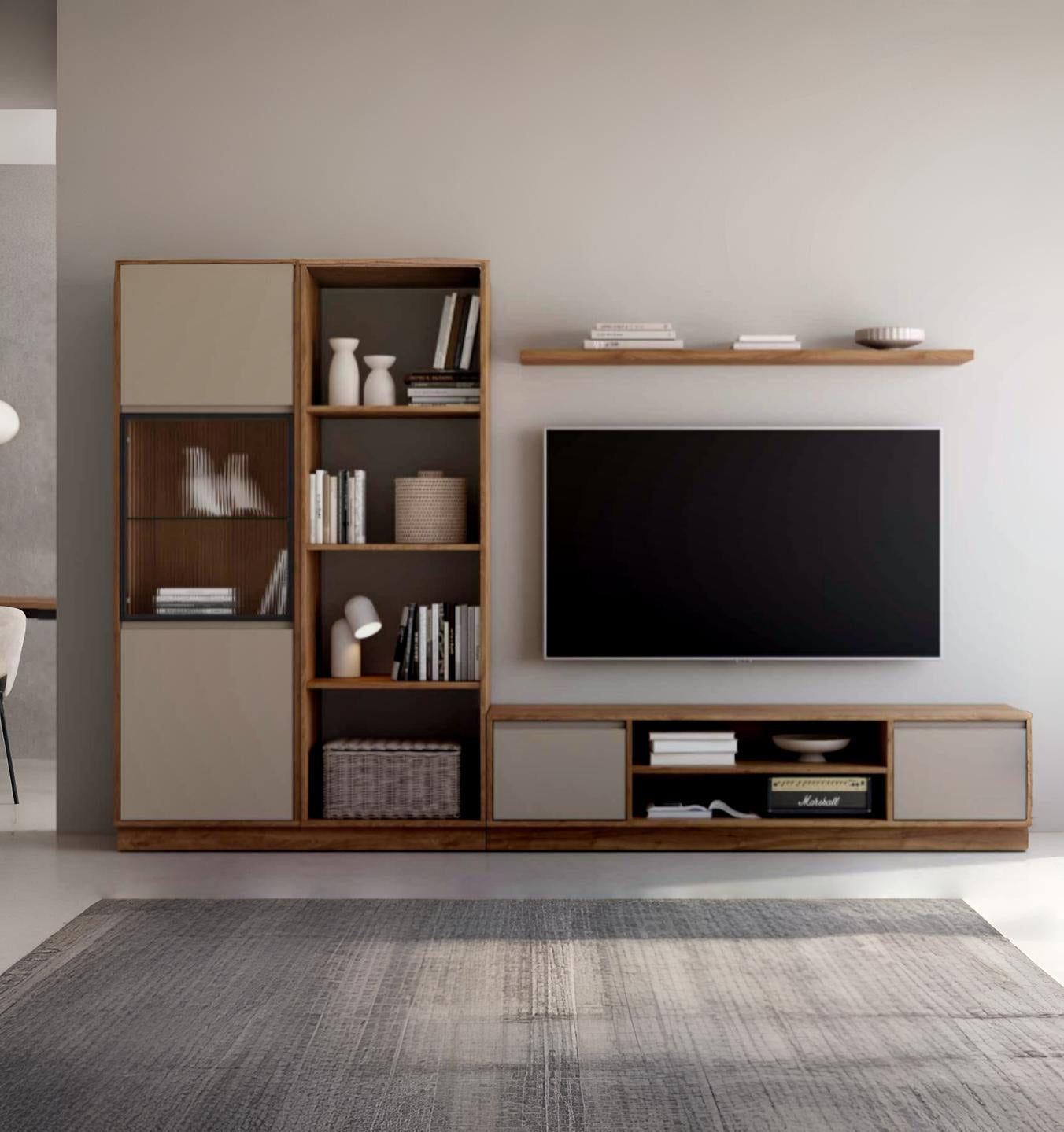 Incluye una gran vitrina de diseño, una estantería diáfana, un mueble bajo para TV y un estante de pared. Esta composición destaca por su robustez e integridad visual gracias a la inclusión de zócalos en su base, que elevan el diseño con una presencia firme y elegante.