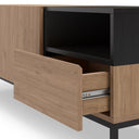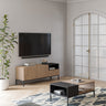 El mueble de TV CAILIN Roble es una mezcla perfecta de estilo y funcionalidad. Con sus dimensiones de 160x55 cm y su elegante color, brinda un aspecto moderno y resistente con sus patas de metal. Fabricado en melamina y metal, proporciona mucho espacio de almacenamiento con 3 puertas y 1 hueco, y añade un toque sofisticado a tu sala de estar.¡Lo mejor para tu hogar!