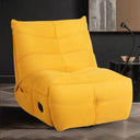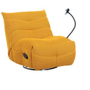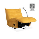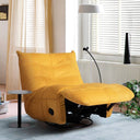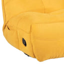 Sillón relax manual tapizado en tela color amarillo, con patas metálicas en color negro y un sistema giratorio y de balancín. El relax se acciona mediante una palanca en el lateral. Dispone de un brazo flexible para colocar el móvil, tanto el asiento como el respaldo están acolchados e incluyen muelles de acero para una sentada de mayor confort.