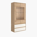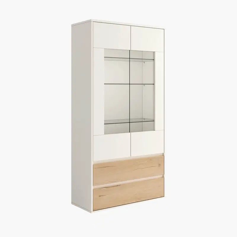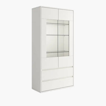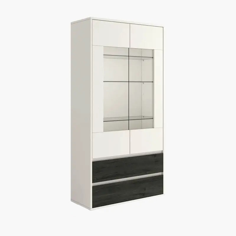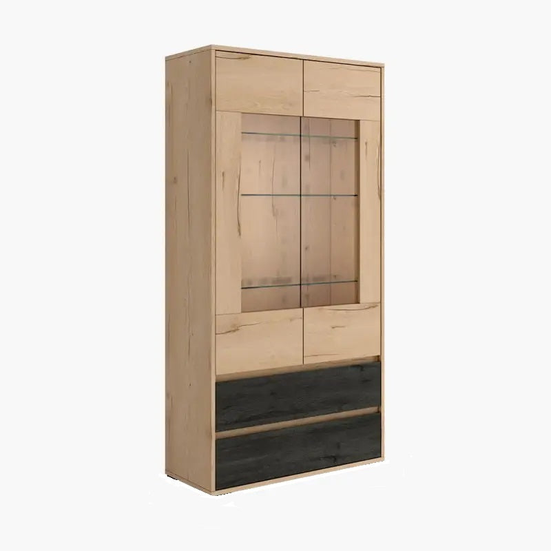 Vitrina con dos puertas con expositor de cristal y dos cajones. De diseño actual, combina funcionalidad y estilo, ofreciendo una gran capacidad de almacenamiento.